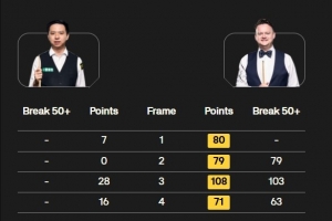 肖恩·墨菲接连打出单杆79、103、63分,目前4-0领先肖国栋进入中场休息。