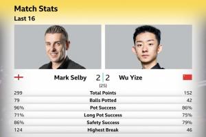 第一阶段上半场战罢,马克·塞尔比2-2战平吴宜泽。